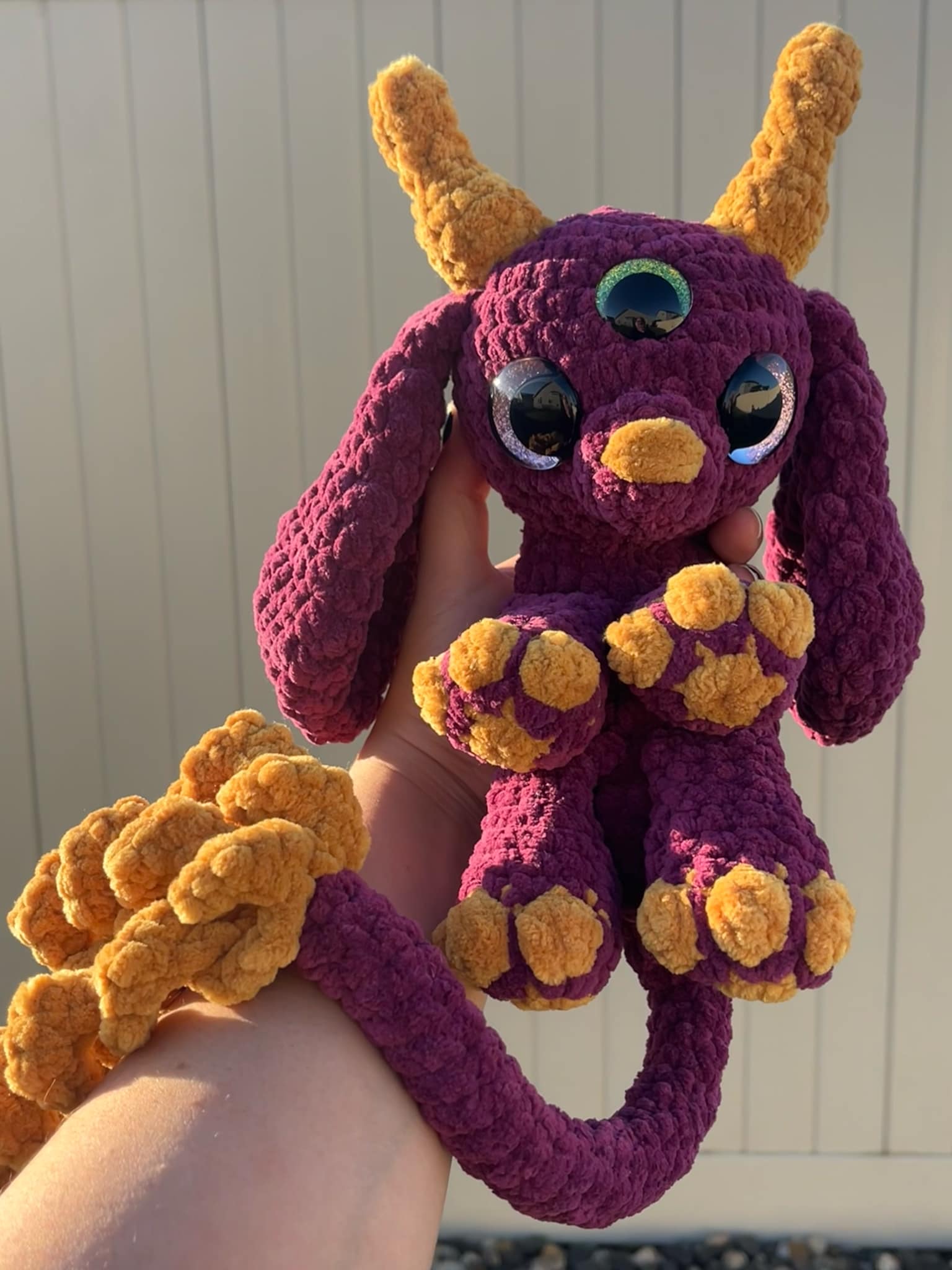 Enchanting and mystical, this Dark Purple and Gold Crochet Celestial Fairy brings a touch of magic to any space. With sparkling eyes that capture the light, she’s crafted from soft, plush yarn for a velvety feel. Her long tail, adorned with delicate curly accents, flows gracefully from her form, measuring 23 inches from horn to the tip of her tail. A celestial beauty, perfect for adding a whimsical, starry charm to your collection.